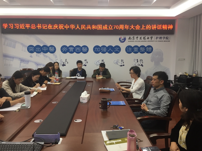 10月9日下午,护理学院党委理论学习中心组在B12-409会议室围绕习近平总书记在庆祝中华人民共和国成立70周年大会上的讲话精神开展集体学习研讨。会议由学院党委王红云书记主持。