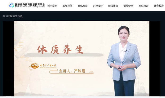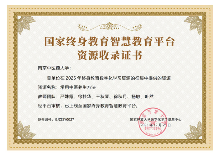 近日,教育部职业教育与成人教育司发布2025年终身教育数字化学习资源征集结果。经学校组织申报,江苏省教育厅推荐,护理学院严姝霞老师作为项目负责人申报的《常用中医养生方法》课程入选2025年终身教育数字化学习资源,并在国家终身教育智慧教育平台正式上线。