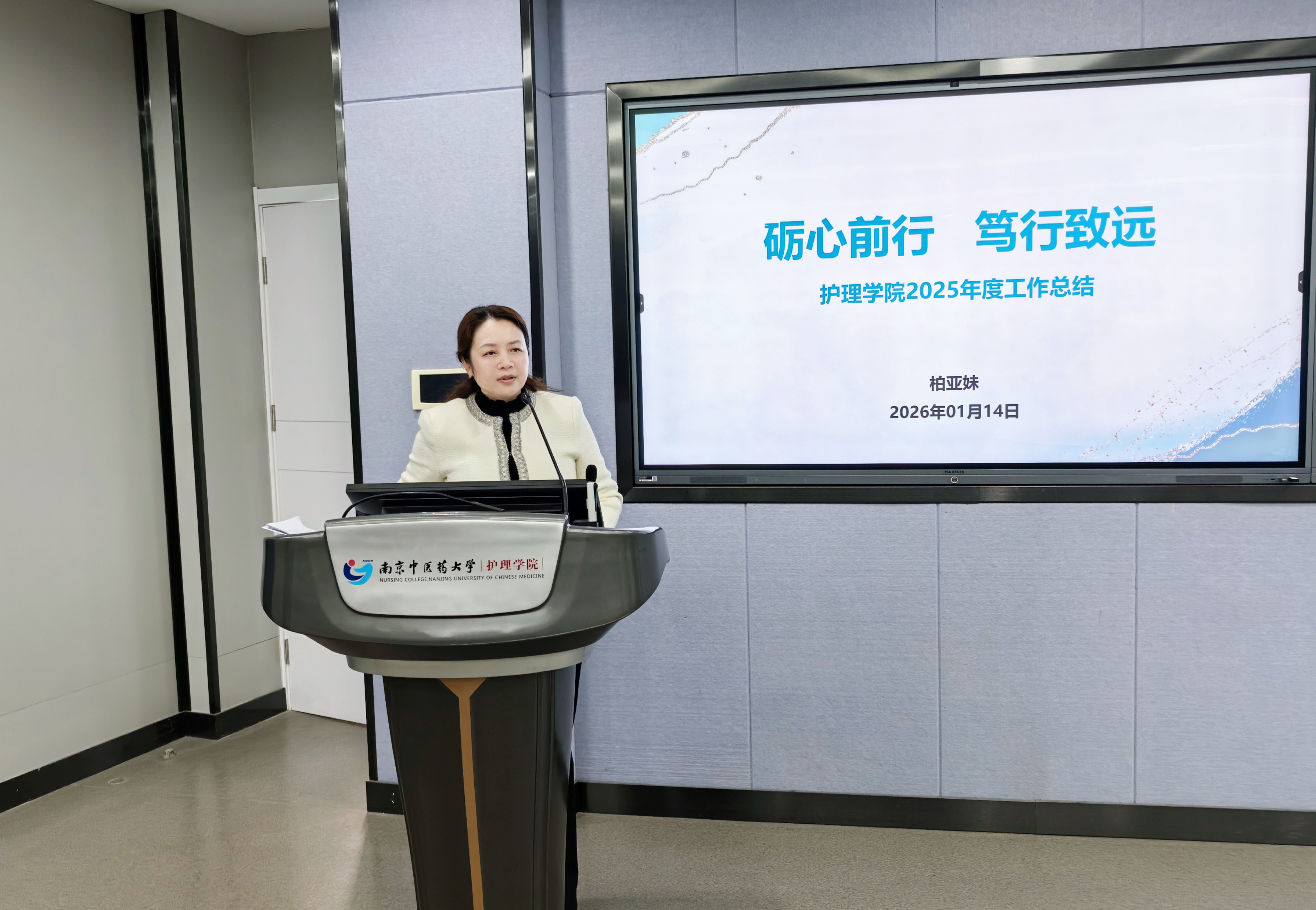 柏亚妹院长在讲话中系统回顾了学院2025年度业务工作。她指出,过去一年学院在学科建设、师资优化、教学提升、学生工作、科研创新、国际合作及社会服务等方面取得显著进展。面向2026年,学院将继续以立德树人为根本,以高质量发展为主线,强化学科交叉、深化教学改革、推动成果转化、拓展国际合作,全面提升办学质量与社会贡献度,加快建设具有国际影响力、国内一流的高水平护理学院。
