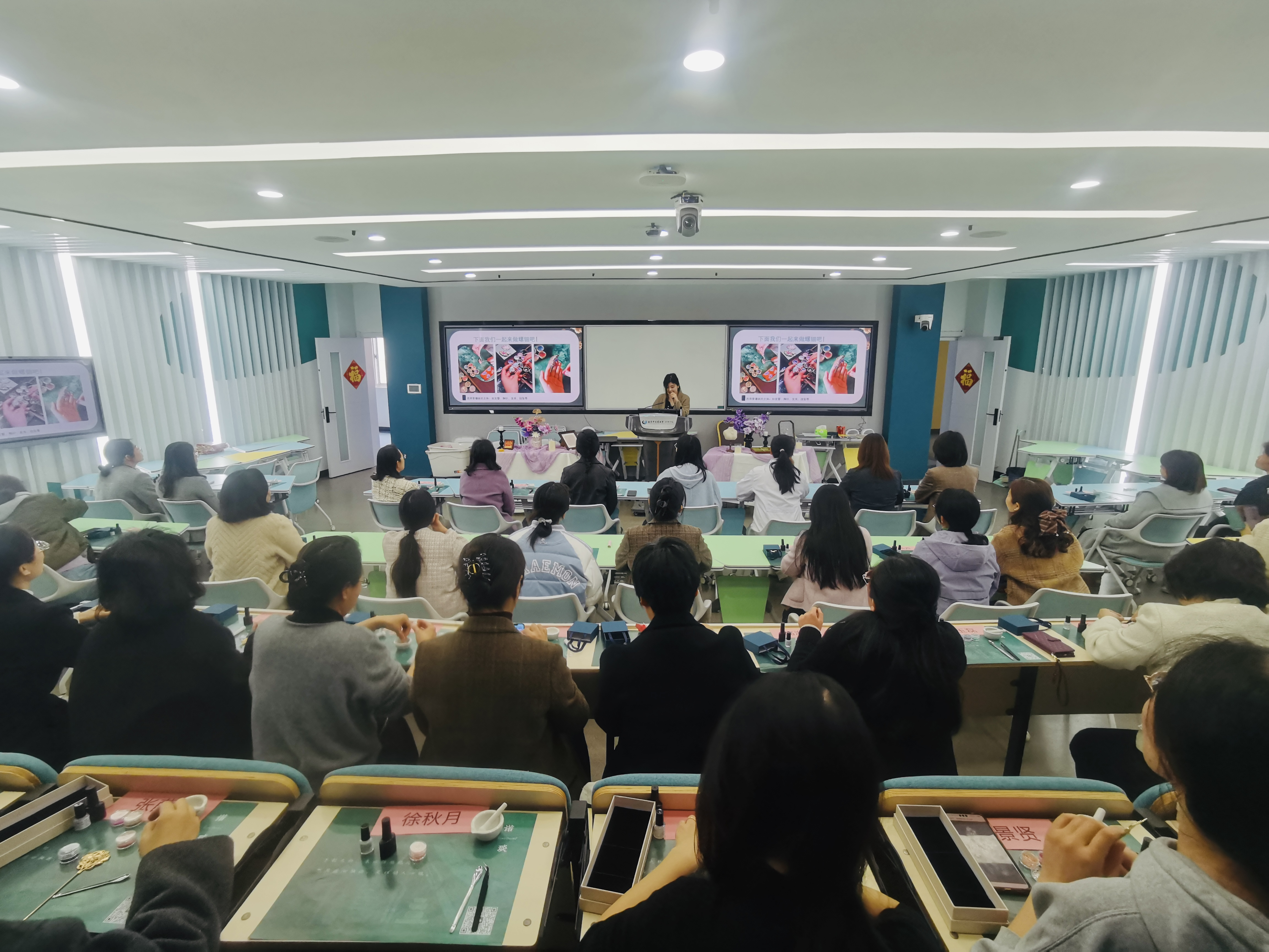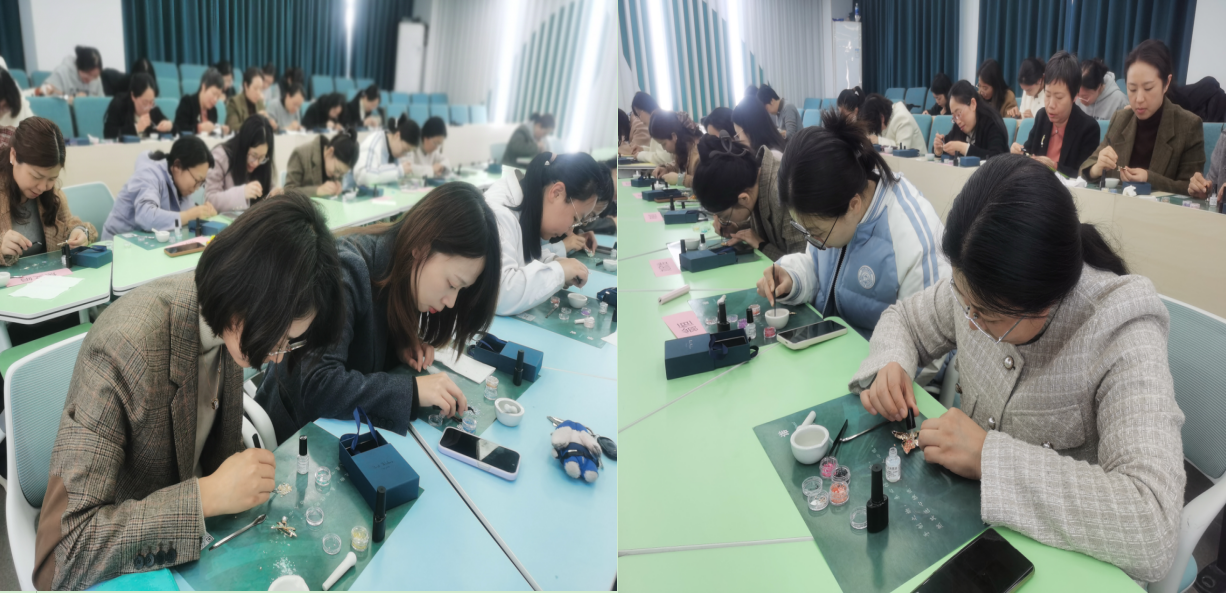 手工制作环节,老师们凝神聚力、巧思迸发,指尖流转间,不起眼的螺钿碎片经过打磨、拼接、镶嵌,在素净的金属胚底上绽放出别样光彩。大家相互交流技巧、分享创意,在动手实践中体悟非遗工艺的别样魅力。随着一件件流光溢彩、独具匠心的螺钿作品相继诞生,方寸之间尽显非遗技艺的璀璨与东方美学的雅致。